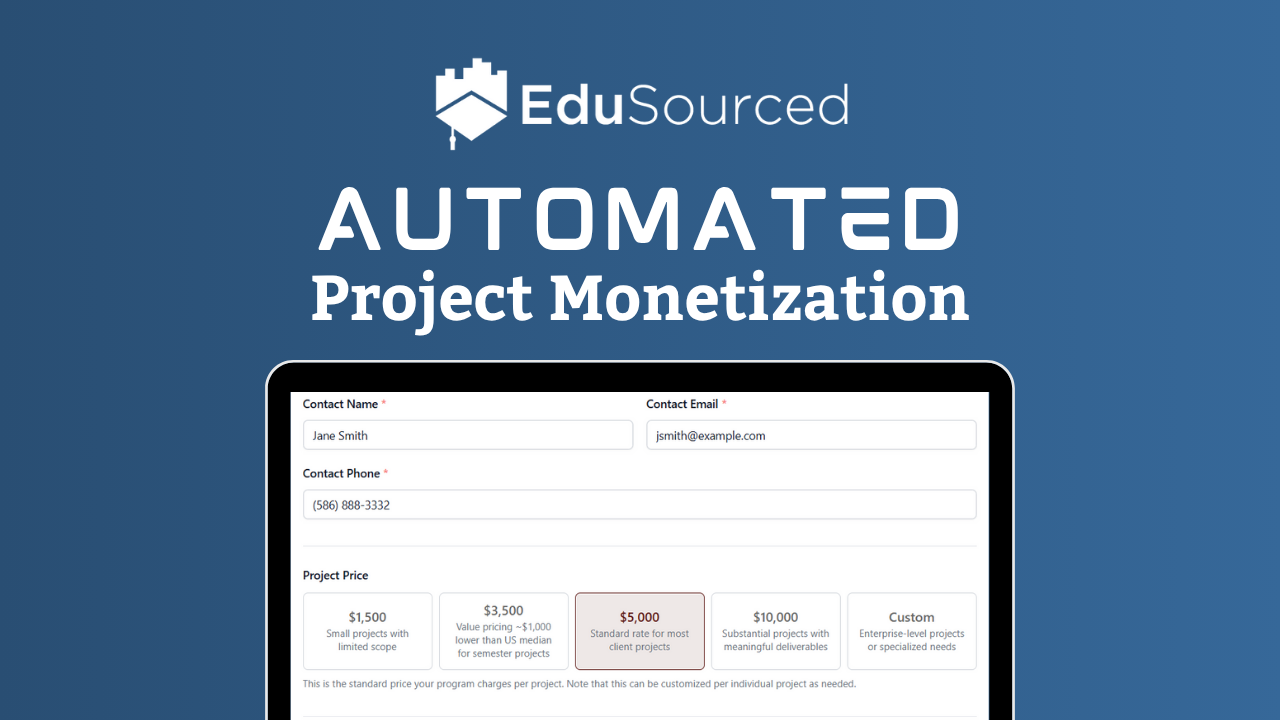 This new EduSourced feature makes collecting revenue from your projects easy and fast. A growing number of our customers have asked us to completely automate project monetization including billing, reminders and payment collection. Of course, some programs prefer to keep their projects no-cost for sponsors (or prefer to manage payments themselves) so this new tool is entirely optional within EduSourced. EduSourced project monetization even streamlines the experience for project clients, and they can pay via bank transfer, (ACH) or card!
